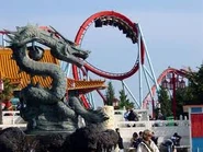 Dragon Khan is a steel sit-down roller coaster located in the China section of PortAventura in Salou, Spain. The attraction is one of seven roller coasters at PortAventura. The attraction is based on Chinese mythology: the Dragon Khan is the reincarnated spirit of Prince Hu, who ruled over Beijing. His fury was unleashed every time a human was dared to climb on its back. This fits perfectly with the ride's location: in the back of the China section.